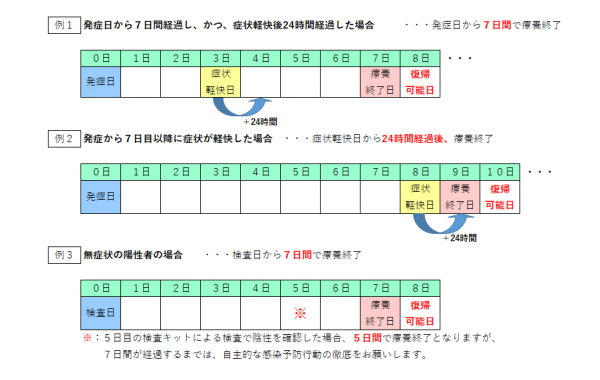 従来と同じく検体採取日から7日間を経過した場合には8日目に療養解除となることに加え、5日目の検査キットによる検査で陰性を確認した場合には、5日間経過後(6日目)に解除となります。