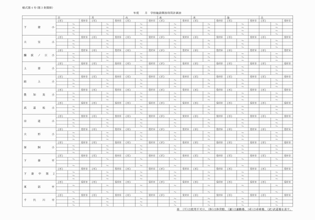 第3条 施設の開放を行う学校(以下「開放校」という。)は、様式第3号による学校開放予定表(翌月分)を作成し、毎月15日までに教育委員会へ提出するものとする。