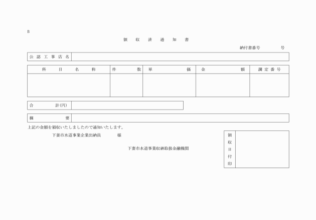 第17条 水道事業主管課長は、納入通知書を亡失し、若しくは損傷した旨の納入義務者からの届出又は納付された証券が支払拒絶された旨の、下妻市水道事業出納取扱金融機関(以下「出納取扱金融機関」という。)若しくは下妻市水道事業収納取扱金融機関(以下「収納取扱金融機関」という。)からの通知を受けたときは、すみやかに納入通知書を再発行し、その余白に「何年何月何日再発行」と記載して当該納入義務者に送付しなければならない。