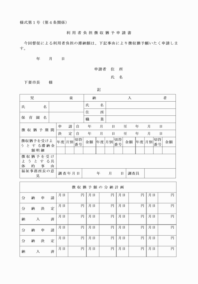 第3条 市立保育所を利用する児童の保護者は、市が指定した納期限までに下妻市子ども・子育て支援法施行細則(令和4年下妻市規則第19号)別表に定める利用者負担額を納付しなければならない。